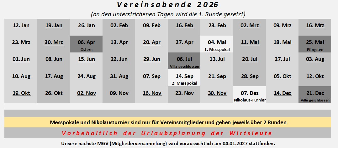 Wir spielen jeden Montag – ab 18:30 Uhr (=Meldeschluss) in der Gaststätte